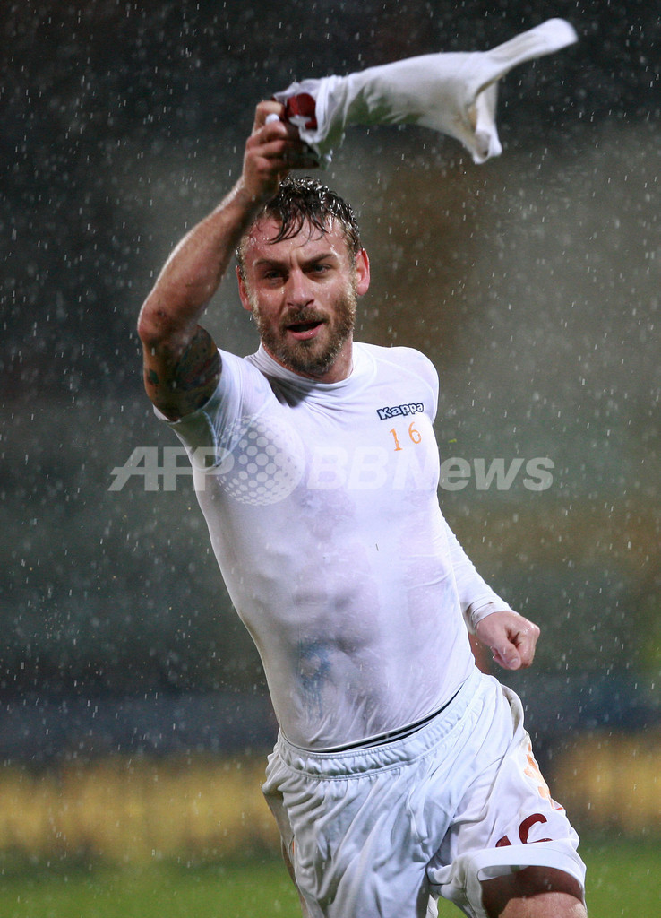 前半28分に同点ゴールを決めて歓喜するASローマのダニエレ・デ・ロッシ(Daniele De Rossi、2012年1月14日撮影)。(c)AFP/Marcello PATERNOSTRO