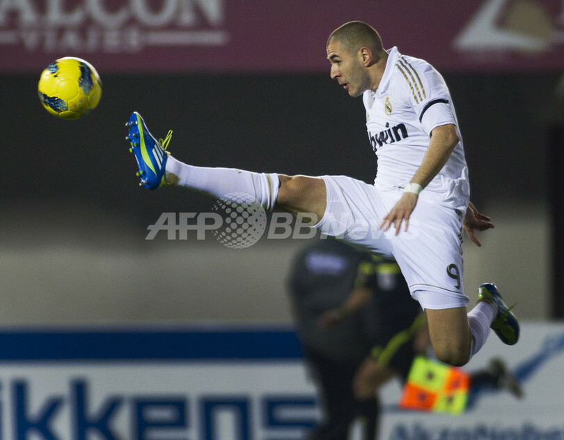 ボールに足を伸ばすレアル・マドリードのカリム・ベンゼマ(Karim Benzema、2012年1月14日撮影)。(c)AFP/JAIME REINA