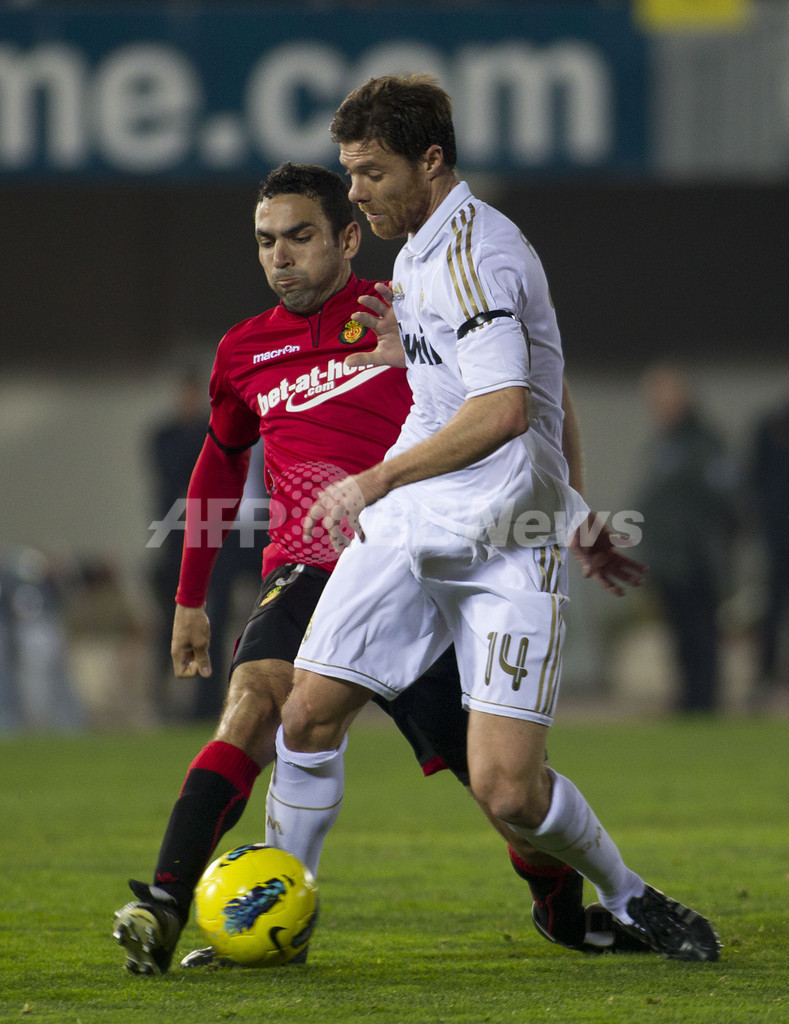 マジョルカのジョアン・ヴィクトル(Joao Victor de Albuquerque Bruno)とボールを競るレアル・マドリードのシャビ・アロンソ(Xabi Alonso、2012年1月14日撮影)。(c)AFP/JAIME REINA