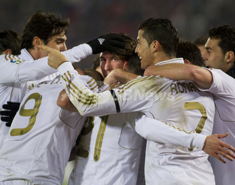 チームの得点に歓喜するレアル・マドリードの選手(2012年1月14日撮影)。(c)AFP/JAIME REINA