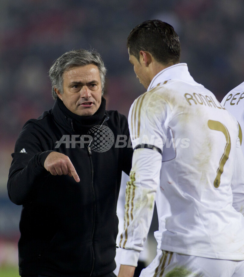 クリスティアーノ・ロナウド(Cristiano Ronaldo)に指示を出すレアル・マドリードのジョゼ・モウリーニョ(Jose Mourinho)監督(2012年1月14日撮影)。(c)AFP/JAIME REINA