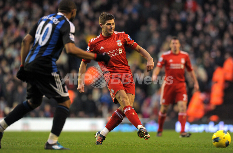 パスを出すリバプールのスティーブン・ジェラード(Steven Gerrard、2012年1月14日撮影)。(c)AFP/PAUL ELLIS