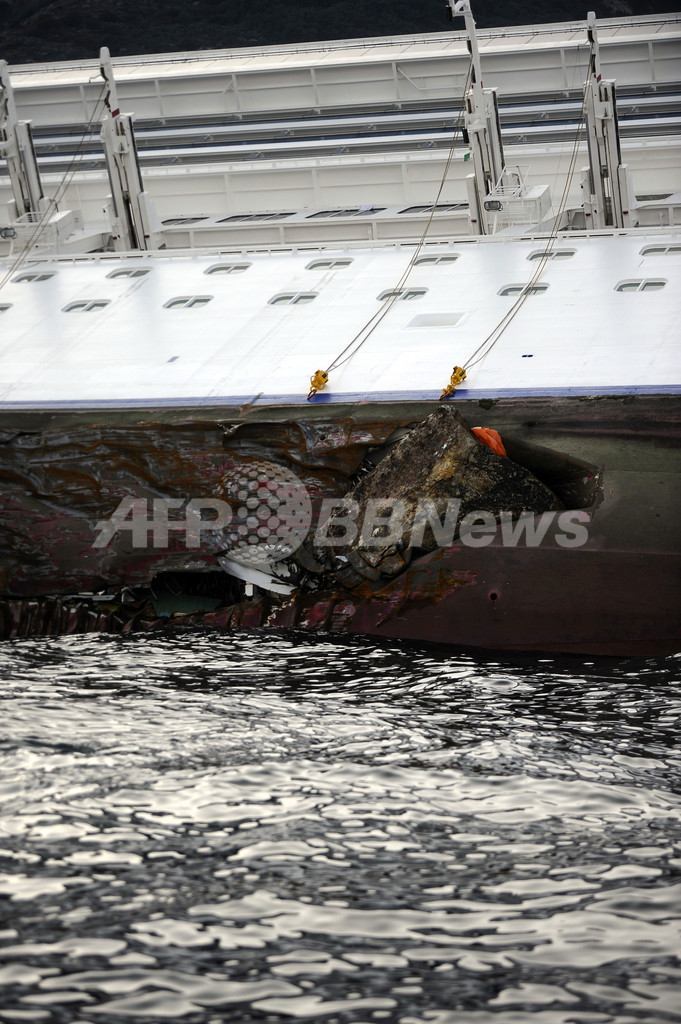 13日にローマ(Rome)そばのチビタベッキア(Civitavecchia)港から出港したコンコルディア号は、その数時間後に岩礁にぶつかったとみられ、船体に70~100メートルの穴が開いた。船は急速に傾き、ジリオ島沖の浅瀬に船体の半分ほどが沈んだ。