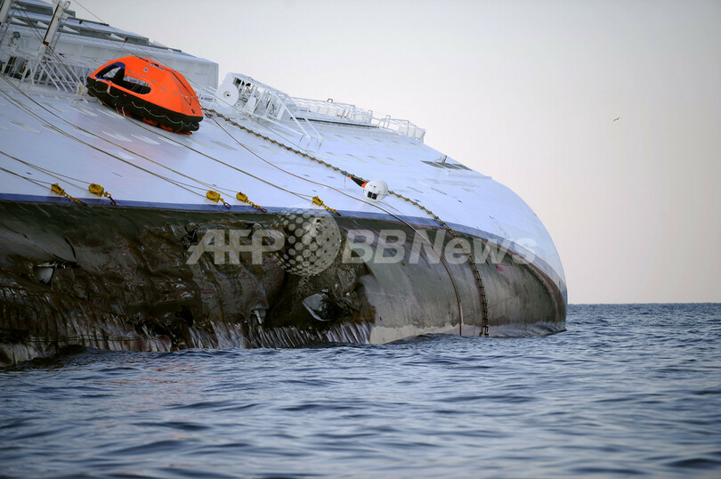 13日にローマ(Rome)そばのチビタベッキア(Civitavecchia)港から出港したコンコルディア号は、その数時間後に岩礁にぶつかったとみられ、船体に70~100メートルの穴が開いた。船は急速に傾き、ジリオ島沖の浅瀬に船体の半分ほどが沈んだ。