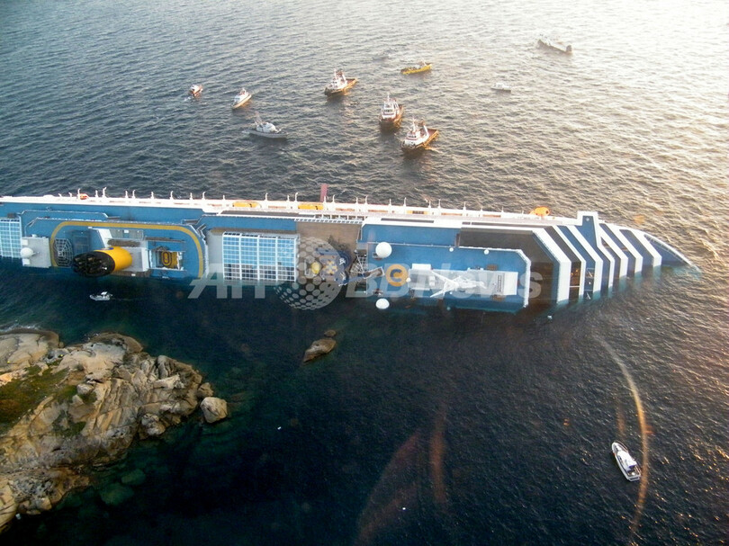 13日にローマ(Rome)そばのチビタベッキア(Civitavecchia)港から出港したコンコルディア号は、その数時間後に岩礁にぶつかったとみられ、船体に70~100メートルの穴が開いた。船は急速に傾き、ジリオ島沖の浅瀬に船体の半分ほどが沈んだ。