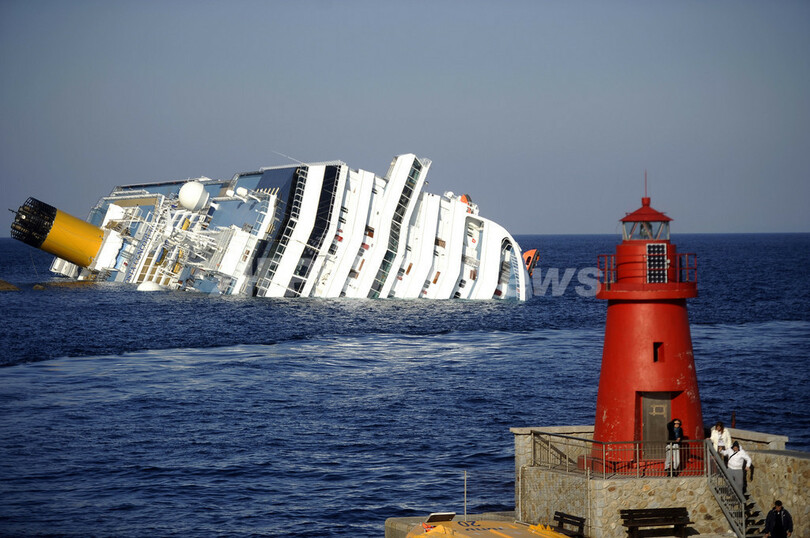 13日にローマ(Rome)そばのチビタベッキア(Civitavecchia)港から出港したコンコルディア号は、その数時間後に岩礁にぶつかったとみられ、船体に70~100メートルの穴が開いた。船は急速に傾き、ジリオ島沖の浅瀬に船体の半分ほどが沈んだ。