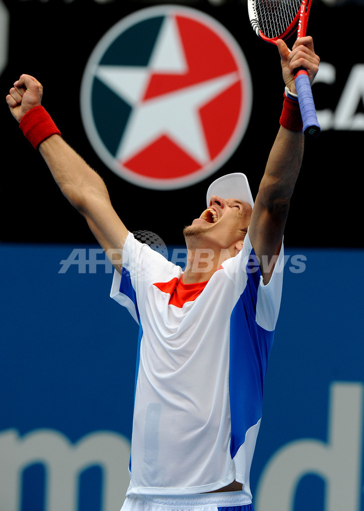 勝利に歓喜するヤルコ・ニエミネン(2012年1月15日撮影)。(c)AFP/Greg WOOD