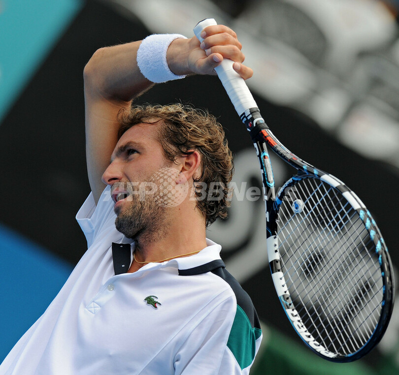 試合中、汗を拭うジュリアン・ベネトー(2012年1月15日撮影)。(c)AFP/Greg WOOD