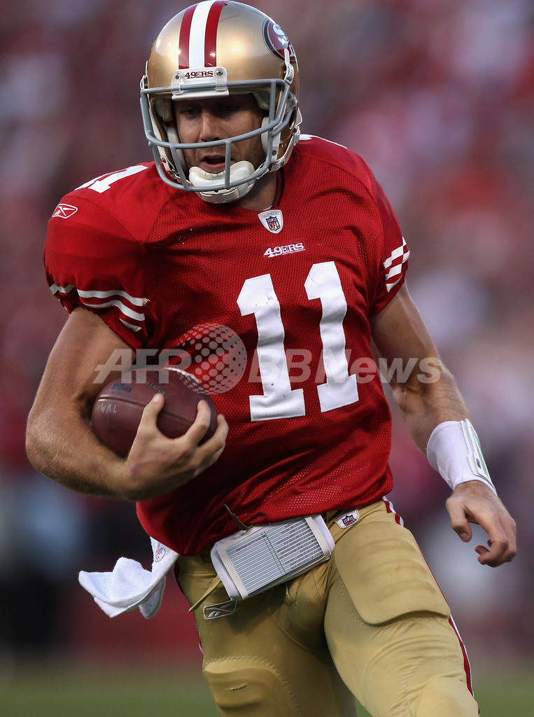 第4クォーターに28ヤードタッチダウンランを決めるフォーティナイナーズのQBアレックス・スミス(Alex Smith、2012年1月14日撮影)。(c)AFP/Getty Images/Jed Jacobsohn