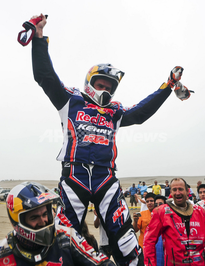 合計タイム43時間28分11秒で総合優勝を果たし、歓喜するKTMのシリル・デプレ(2012年1月15日撮影)。(c)AFP/ERNESTO BENAVIDES