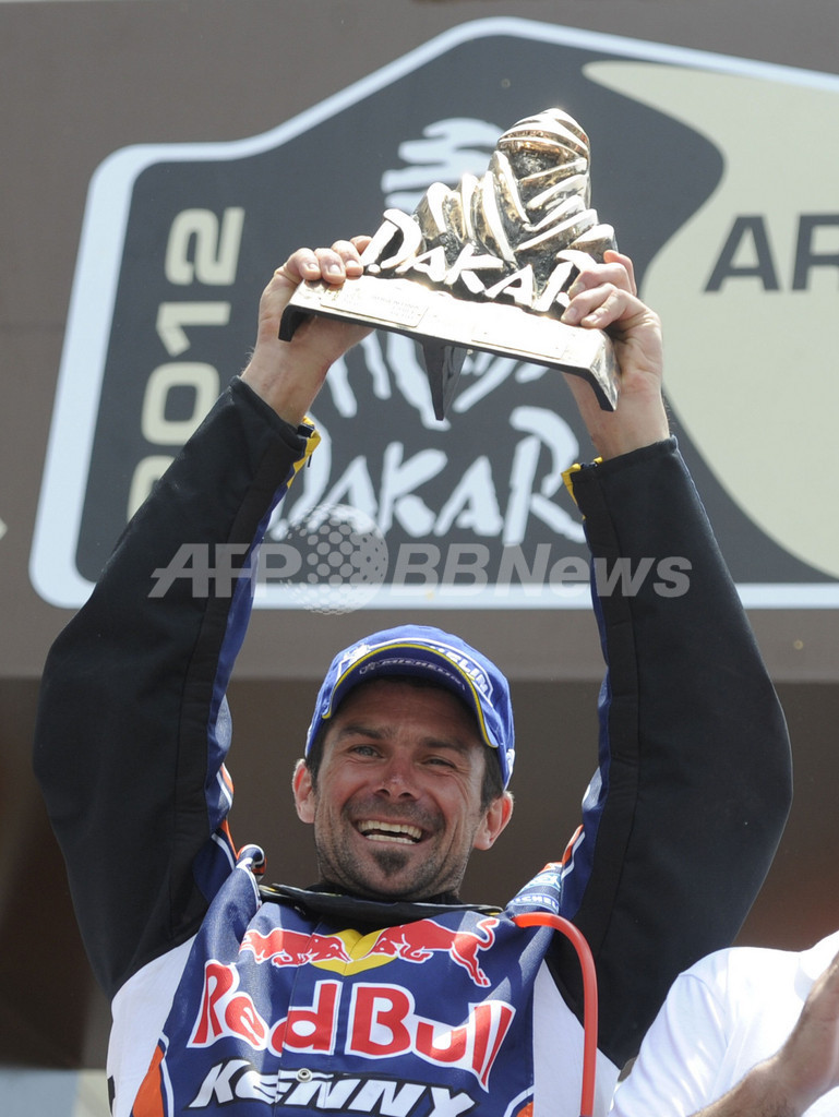 表彰式でトロフィーを掲げるKTMのシリル・デプレ(2012年1月15日撮影)。(c)AFP/PHILIPPE DESMAZES