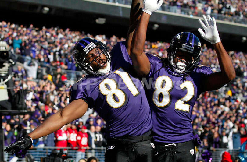 第1クウォーターにタッチダウンを成功させ、チームメイトのトレイ・スミス(Torrey Smith、右)と喜びを分かち合うレイブンズのアンクワン・ボウルディン(Anquan Boldin、2012年1月15日撮影)。(c)AFP/Getty Images/Rob Carr