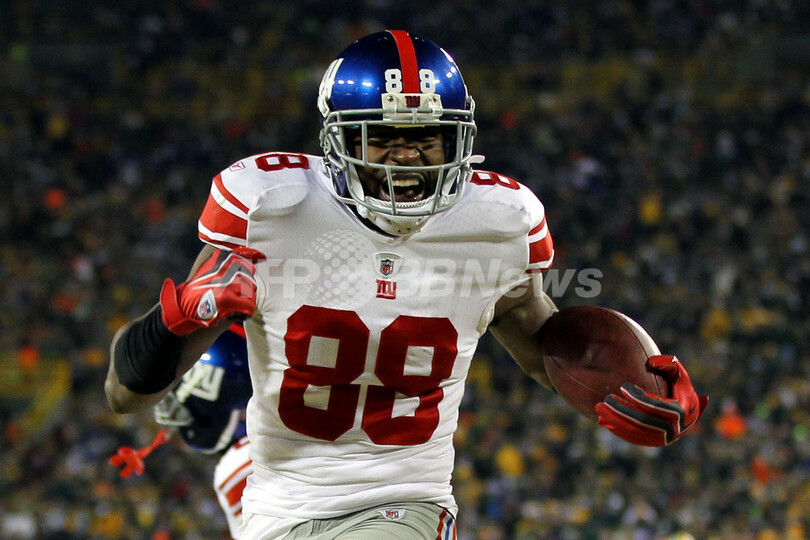第2クォーターに37ヤードのタッチダウンパスをキャッチし、歓喜するジャイアンツのアキーム・ニックス(Hakeem Nicks、2012年1月15日撮影)。(c)AFP/Getty Images/Jamie Squire