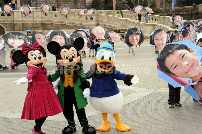 【1月16日 AFP】東京ディズニーランド(Tokyo Disneyland)で16日、子どもたちの笑顔がプリントされた傘を一斉に開いて人々に未来への希望や平和への願いを発信する、「笑顔の傘」と銘打たれたアートパフォーマンスが行われた。