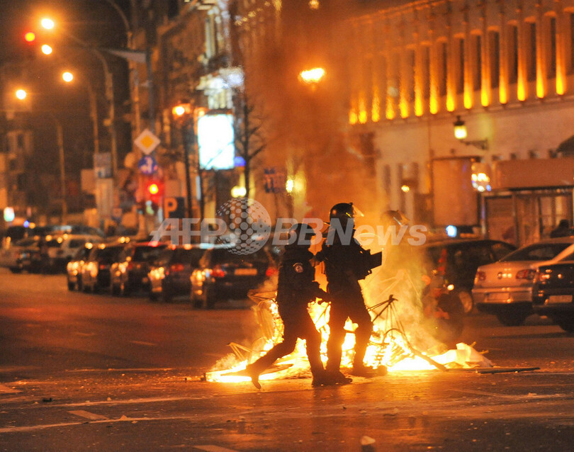 【1月16日 AFP】ルーマニアの首都ブカレスト(Bucharest)で15日、政府の財政緊縮政策に抗議し、トライアン・バセスク(Traian Basescu)大統領の辞任を求めるデモが行われ、デモ隊と機動隊が衝突した。(c)AFP
