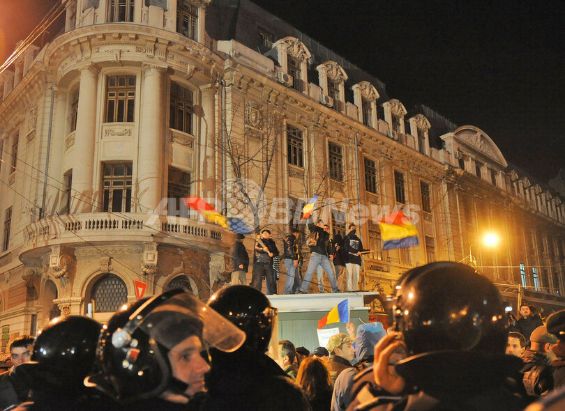 【1月16日 AFP】ルーマニアの首都ブカレスト(Bucharest)で15日、政府の財政緊縮政策に抗議し、トライアン・バセスク(Traian Basescu)大統領の辞任を求めるデモが行われ、デモ隊と機動隊が衝突した。(c)AFP