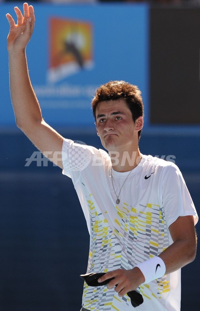 試合に勝利し、笑顔を見せるバーナード・トミック(2012年1月16日撮影)。(c)AFP/William WEST