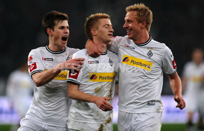 前半11分に先制点を挙げ、チームメイトのハヴァルト・ノルトヴァイト(Havard Nordtveit)とマイク・ハンケ(Mike Hanke)に祝福されるボルシア・メンヘングラッドバッハのマルコ・ロイス(Marco Reus、2012年1月20日撮影)。(c)AFP/PATRIK STOLLARZ