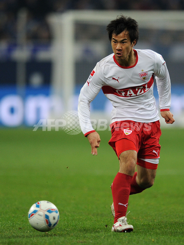 ボールをコントロールするVfBシュツットガルトの岡崎慎司(Okazaki Shinji、2012年1月21日撮影)。(c)AFP/PATRIK STOLLARZ