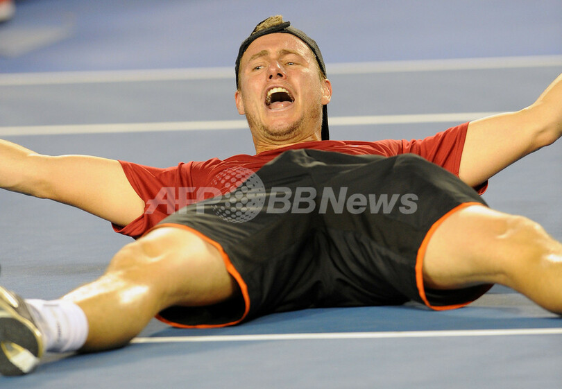 試合に勝利し歓喜するレイトン・ヒューイット(2012年1月21日撮影)。(c)AFP/WILLIAM WEST