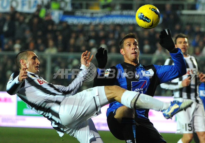 アタランタのヘルマン・デニス(German Gustavo Denis)とボールを競るユベントスのジョルジョ・キエッリーニ(Giorgio Chiellini、2012年1月21日撮影)。(c)AFP/OLIVIER MORIN