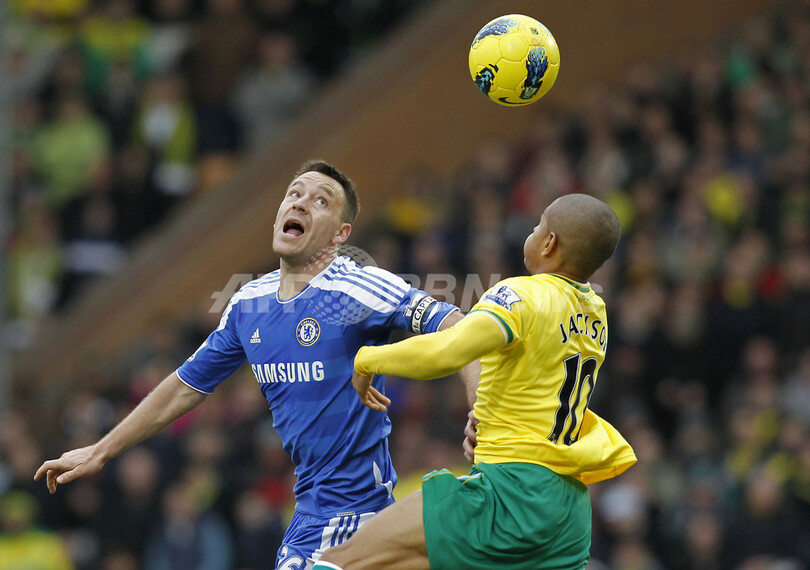 ノリッジ・シティのシメオン・ジャクソン(Simeon Jackson)とボールを競るチェルシーのジョン・テリー(John Terry、2012年1月21日撮影)。(c)AFP/IAN KINGTON