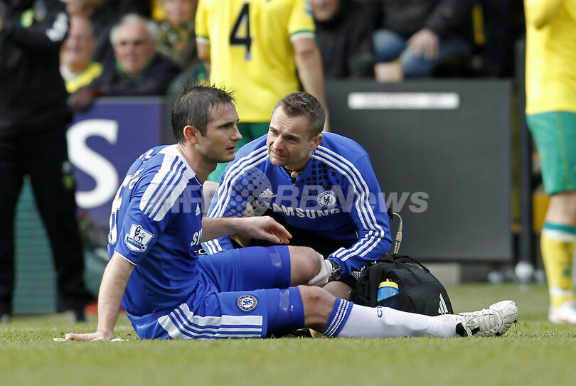 試合中に負傷し治療を受けるチェルシーのフランク・ランパード(Frank Lampard、2012年1月21日撮影)。(c)AFP/IAN KINGTON