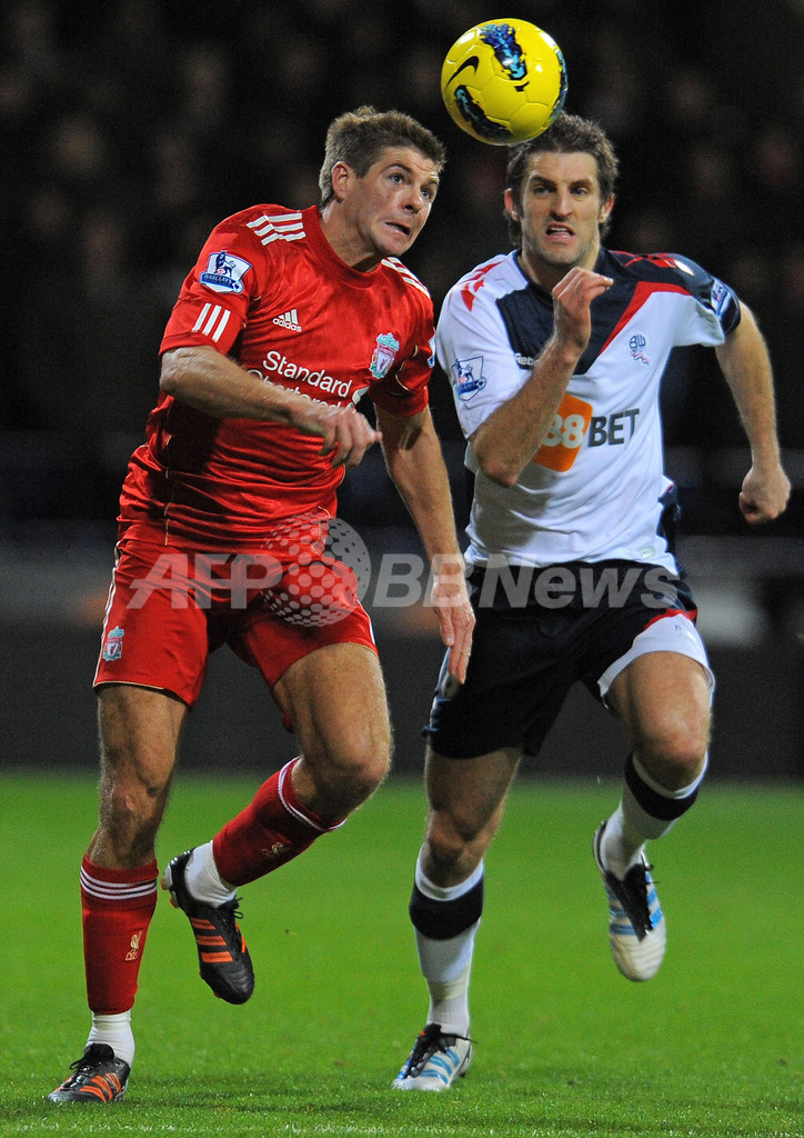 ボルトン・ワンダラーズのサム・リケッツ(Samuel Ricketts、右)とボールを競るリバプールのスティーブン・ジェラード(Steven Gerrard、2012年1月21日撮影)。(c)AFP/ANDREW YATES