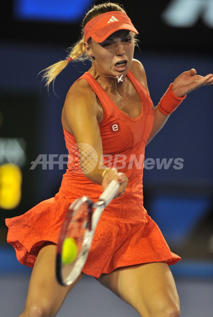 リターンを打つカロリーネ・ボズニアツキ(2012年1月22日撮影)。(c)AFP/PAUL CROCK