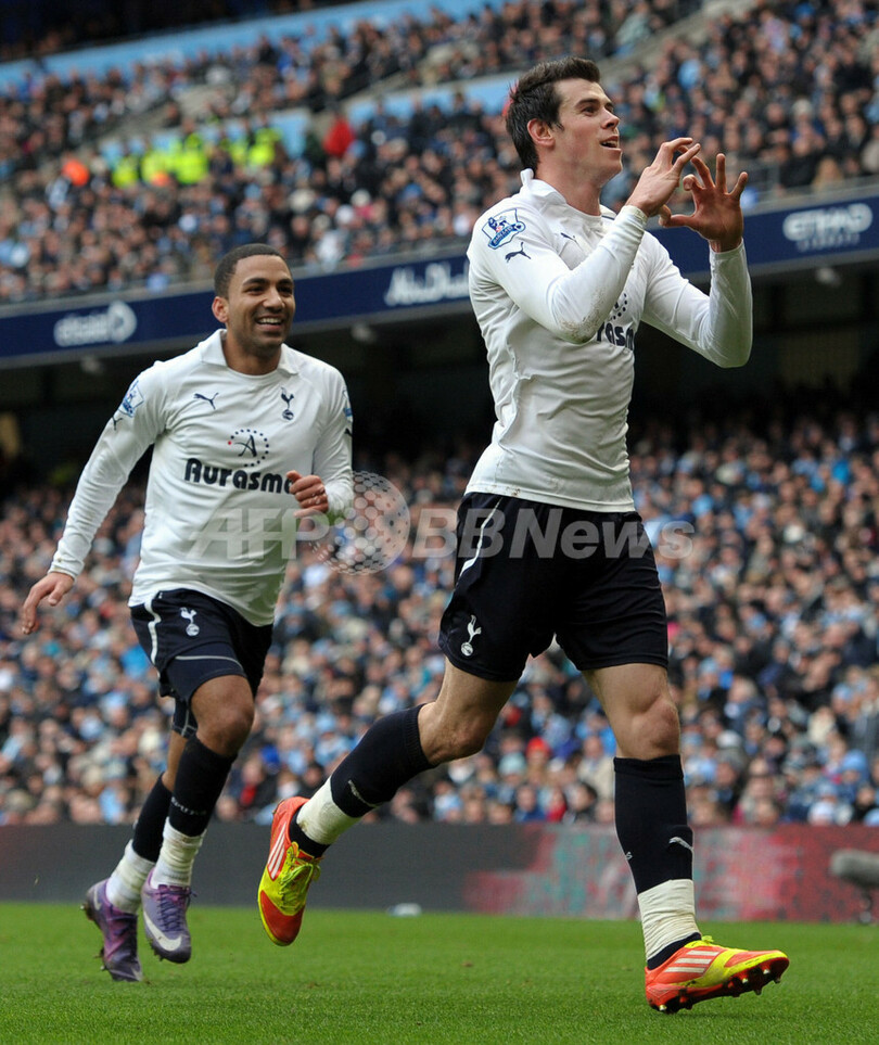 後半20分に同点ゴールを挙げ、歓喜するトッテナム・ホットスパーのギャレス・ベイル(Gareth Bale、2012年1月22日撮影)。(c)AFP/PAUL ELLIS