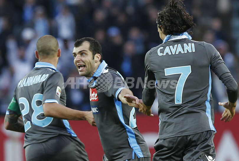 ゴールを決め歓喜するナポリのゴラン・パンデフ(Goran Pandev、中央、2012年1月22日撮影)。(c)AFP/FABIO MUZZI