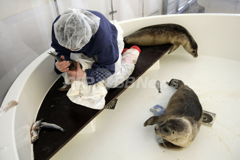 写真はアザラシに魚を食べさせるボランティア(2012年1月16日撮影)。(c)AFP/Anoek de Groot
