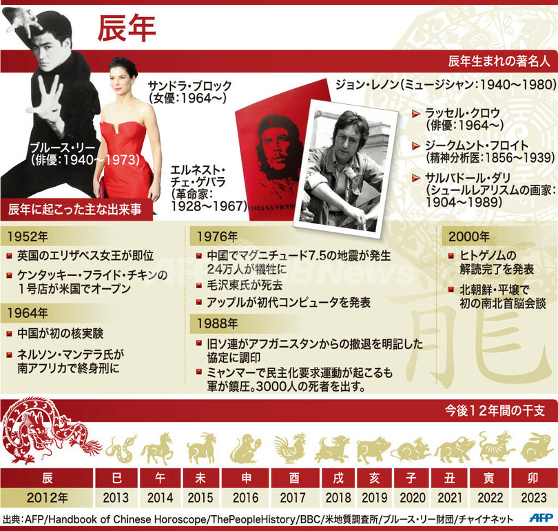 ニュース ライフ 図解 【図解】過去にはこんな事が!辰年のあれこれ 2012年1月23日 16:52 発信地:香港 このニュースをシェア (c)AFP 【1月23日 AFP】中国などでは23日、旧暦の正月にあたる春節を迎え、辰年がスタートした。中国では龍は吉兆と考えられている。図は、辰年生まれの著名人や過去の辰年に起こった出来事などについて示したもの。(c)AFP<ニュース解説画像一覧へ> ライフ 一覧へ> メディア・報道関係・法人の方向け 写真・動画 購入のお問合せ>