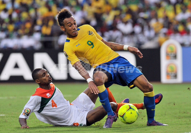 タックルを受けるガボンのピエール・エメリク・ オーバメヤン(Pierre-Emerick Aubameyang、右、2012年1月23日撮影)。(c)AFP/ISSOUF SANOGO