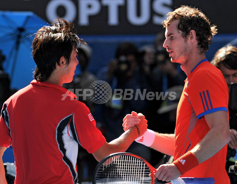 試合後に錦織圭(左)と握手を交わすアンディ・マレー(2012年1月25日撮影)。(c)AFP/NICOLAS ASFOURI
