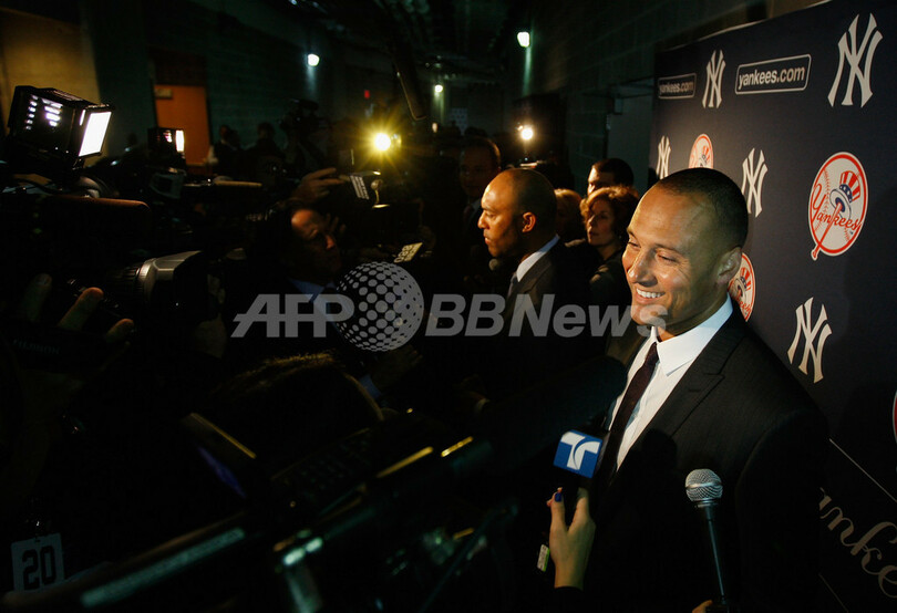 記者会見場を訪れたニューヨーク・ヤンキースのデレク・ジーター(Derek Jeter、2012年1月25日撮影)。(c)AFP/Getty Images/Mike Stobe