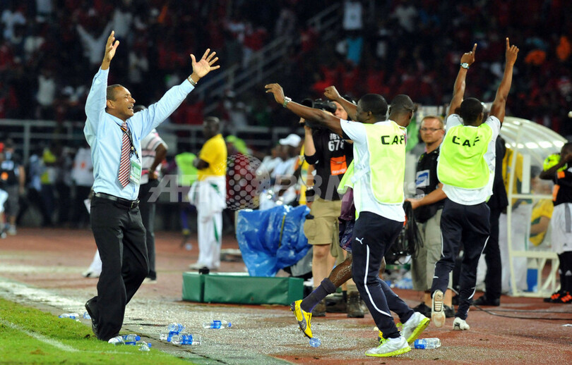 試合に勝利し、歓喜する赤道ギニアのジウソン・パウロ監督(Gilson Paulo de Mello Filho、左)と選手(2012年1月25日撮影)。(c)AFP/ABDELHAK SENNA
