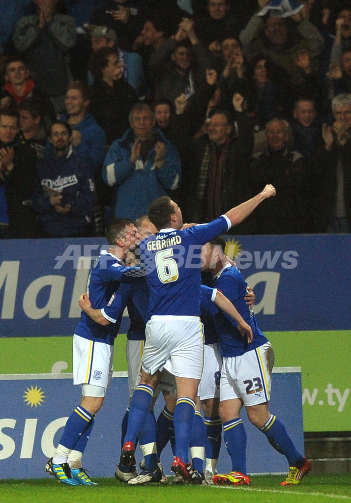 前半7分にオウンゴールで先制し、歓喜するカーディフ・シティの選手(2012年1月24日撮影)。(c)AFP/PAUL ELLIS