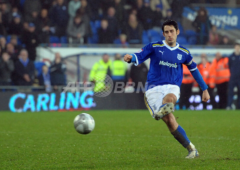 PK戦でシュートを放つカーディフ・シティのピーター・ウィッティンガム(Peter Whittingham、2012年1月24日撮影)。(c)AFP/PAUL ELLIS