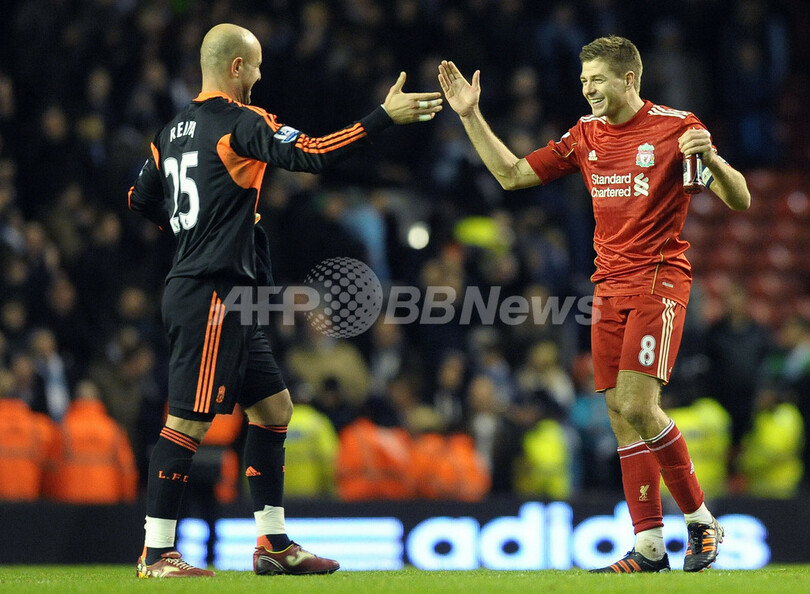 決勝進出を決め、GKのホセ・マヌエル・レイナ(Jose Manuel Reina、左)と歓喜するリバプールのスティーブン・ジェラード(Steven Gerrard、2012年1月25日撮影)。(c)AFP/PAUL ELLIS