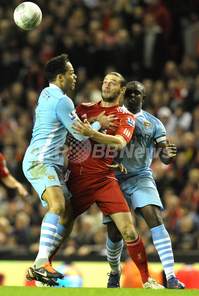 マンチェスター・シティのジョレオン・レスコット(Joleon Lescott、左)、ミカ・リチャーズ(Micah Richards、右)とボールを競るリバプールのアンディー・キャロル(Andy Carroll、2012年1月25日撮影)。(c)AFP/PAUL ELLIS