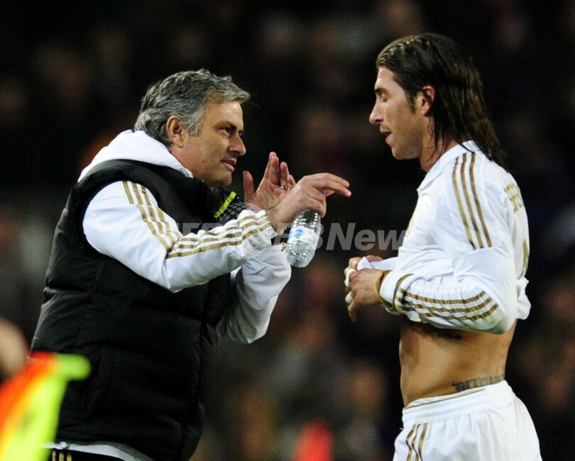 レッドカードを受けたセルヒオ・ラモス(Sergio Ramos、右)と言葉を交わすレアル・マドリードのジョゼ・モウリーニョ監督(Jose Mourinho、2012年1月25日撮影)。(c)AFP/JAVIER SORIANO