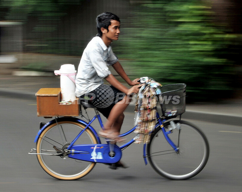 多くの行商人たちと同じく着古したTシャツにサンダル姿のサンバンさん(28)は、1年前にジャカルタ(Jakarta)に出て来るまでは農民だった。「フランチャイズ・エージェント」の1つに「事業立ち上げ料」として150ドル(約1万1500円)を支払い、自転車と魔法瓶を入手。お湯の手配やコーヒー、プラスチック・カップの経費として月30ドル(約2300円)をエージェントに収め、差し引いた収入は月々平均100ドル(約7700円)前後になる。