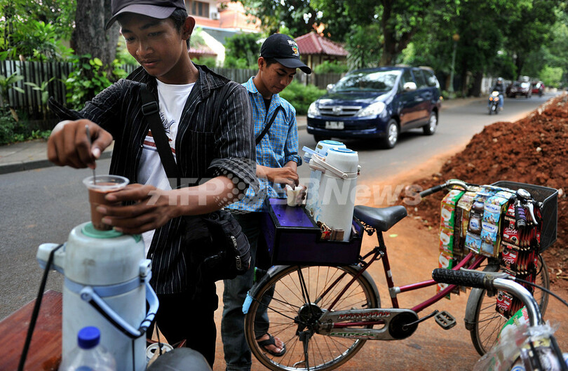 多くの行商人たちと同じく着古したTシャツにサンダル姿のサンバンさん(28)は、1年前にジャカルタ(Jakarta)に出て来るまでは農民だった。「フランチャイズ・エージェント」の1つに「事業立ち上げ料」として150ドル(約1万1500円)を支払い、自転車と魔法瓶を入手。お湯の手配やコーヒー、プラスチック・カップの経費として月30ドル(約2300円)をエージェントに収め、差し引いた収入は月々平均100ドル(約7700円)前後になる。