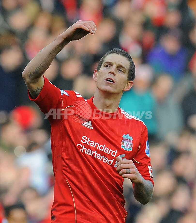 前半21分に先制点を挙げて歓喜するリバプールのダニエル・アッガー(Daniel Agger、2012年1月28日撮影)。(c)AFP/ANDREW YATES