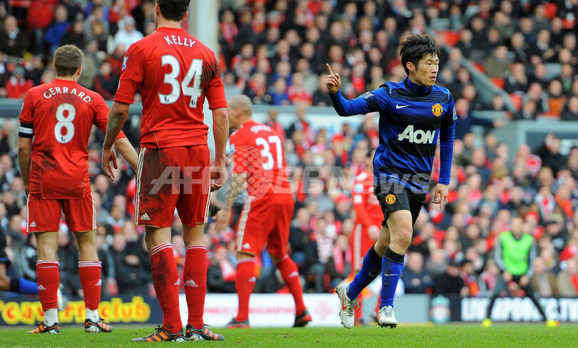 前半39分に同点ゴールを決めて歓喜するマンチェスター・ユナイテッドの朴智星(Park Ji-sung、パク・チソン、2012年1月28日撮影)。(c)AFP/ANDREW YATES