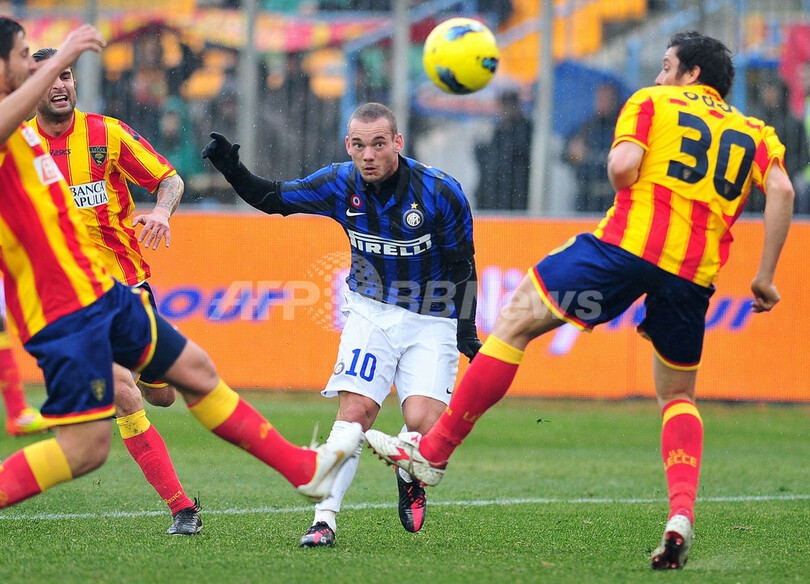 レッチェの選手に囲まれながらもボールをヘディングするインテルのウェズレイ・スナイデル(Wesley Sneijder、2012年1月29日撮影)。(c)AFP/ALBERTO PIZZOLI