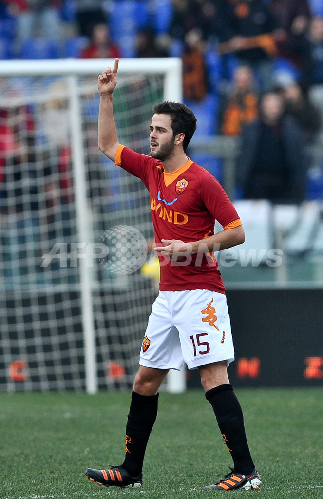 後半17分に同点ゴールを決めて歓喜するASローマのミラレム・ピャネツ(Miralem Pjanic、2012年1月29日撮影)。(c)AFP/ANDREAS SOLARO