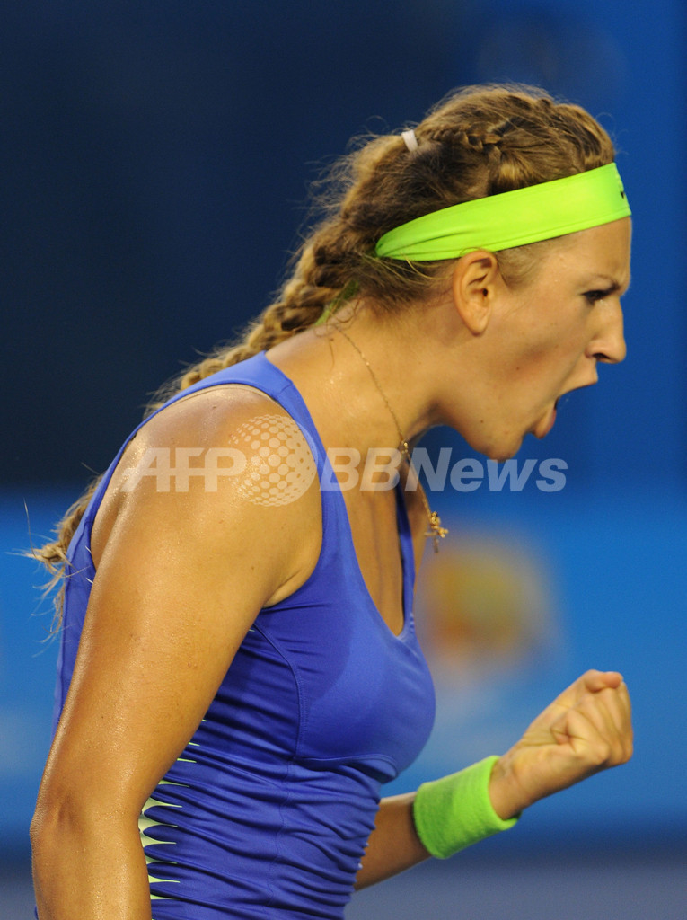 ポイントを奪い歓喜するビクトリア・アザレンカ(2012年1月28日撮影)。(c)AFP/WILLIAM WEST