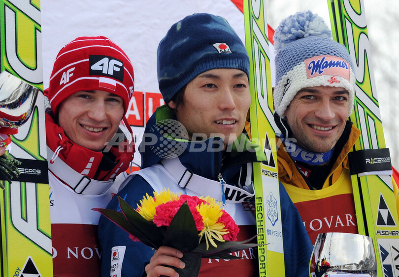 表彰式に臨む(左から)2位のカミル・ストフ、優勝した伊東大貴、3位のアンドレアス・コフラー(2012年1月29日撮影)。(c)AFP/TOSHIFUMI KITAMURA